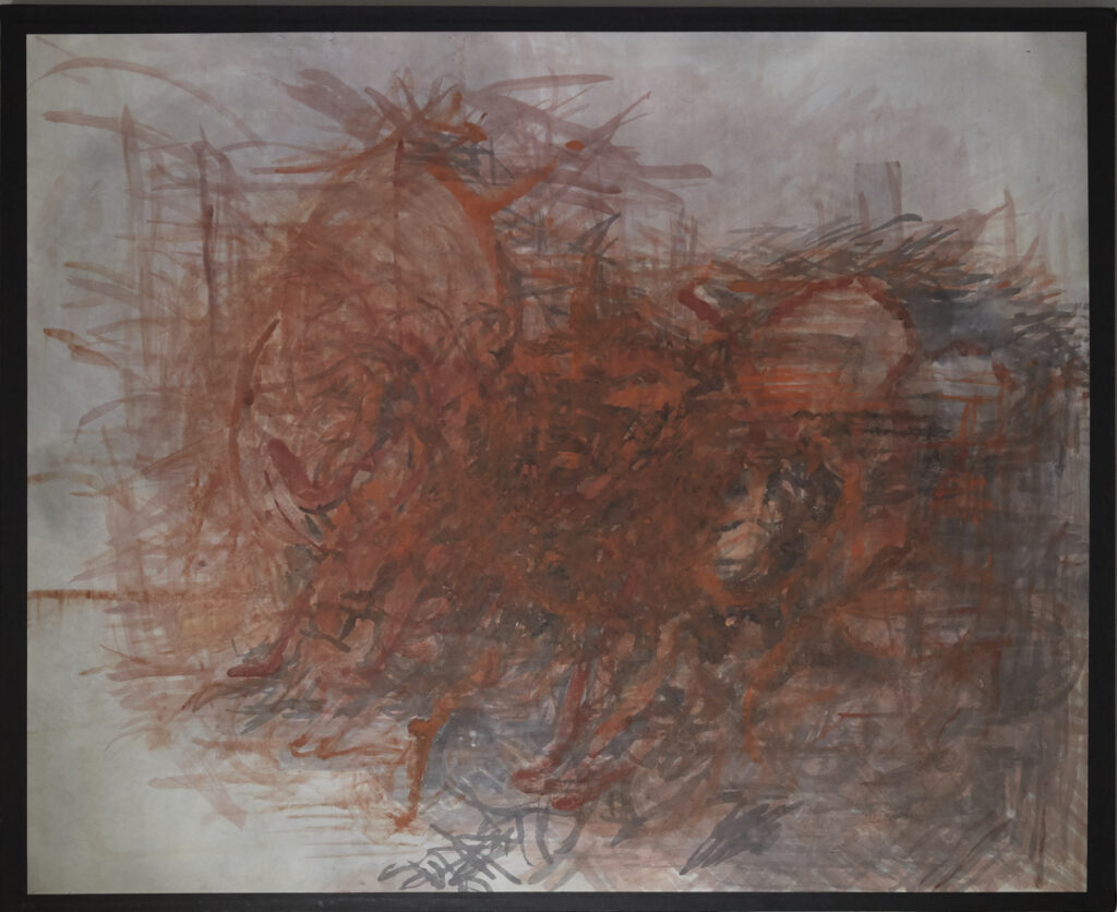 向こうから吹き抜けてこちらへ;それを観る人々Something’s coming in through the grid lines net-like どこへ行く期待がある予感がする 2023 麻紙、胡粉・墨・顔料 630×770mm